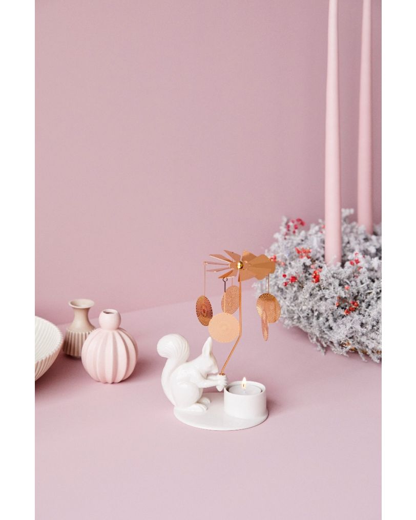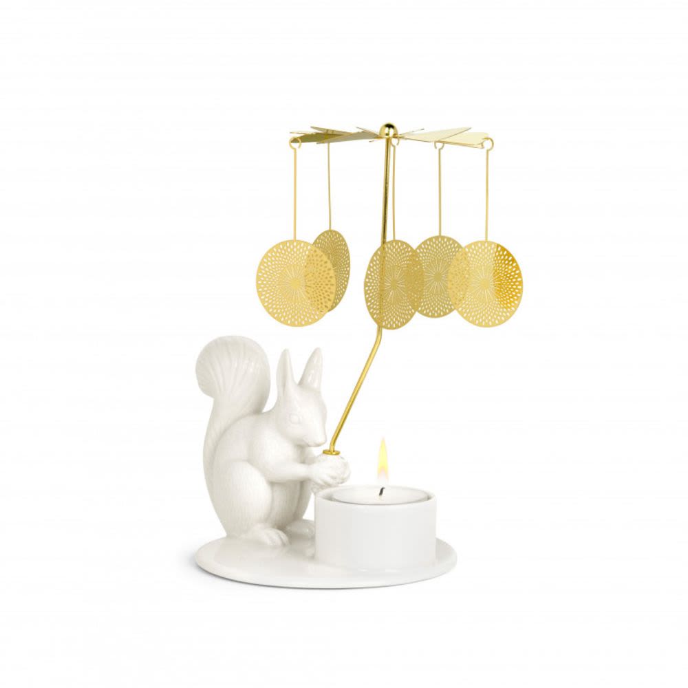 Lysestake, Squirrel, med englespill fra Winter Stories-serien til Dottir. Denne lysestaken llustrerer et ekkorn som holder et lite englespill som beveger seg fint når telyset er  tent. En fin detalj i interiøret på vinterhalvåret, og også fin som pynt til jul. Winter Stories er en koselig serie til hjemmet som skaper en varm og god atmostfære. Måler 13 cm i høyden.