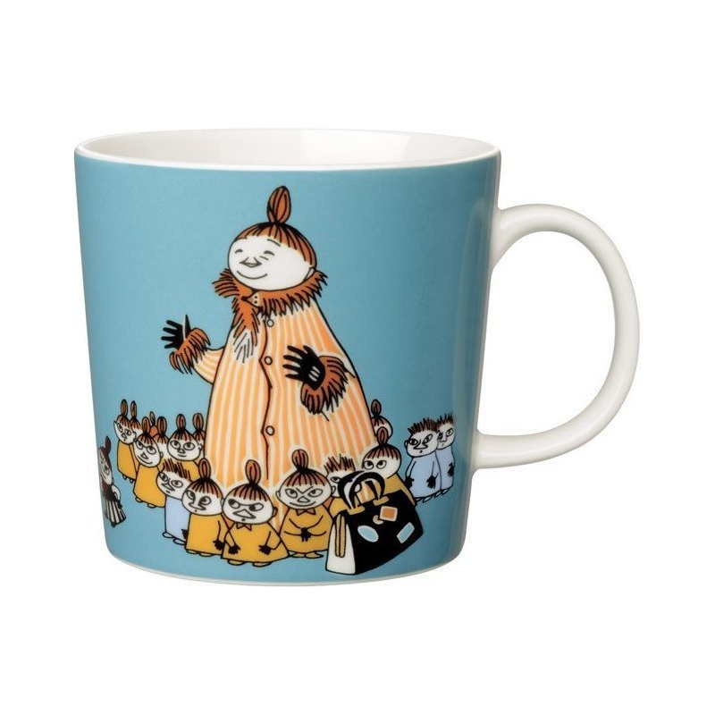 Dette mørkeblå/turkise Mummi-kruset fra 2012 forestiller Mymlens mor med alle de små barna sine. Det er nydelig illustrert av Arabia-kunstneren Tove Slotte, og bildene på kruset finnes i den andre Mummi-tegneserien. Gjør samlingen din av Mummi-krus komplett med dette vakre kruset. Størrelse: 0,3 L. Materiale: keramikk. Tåler maskinvask.