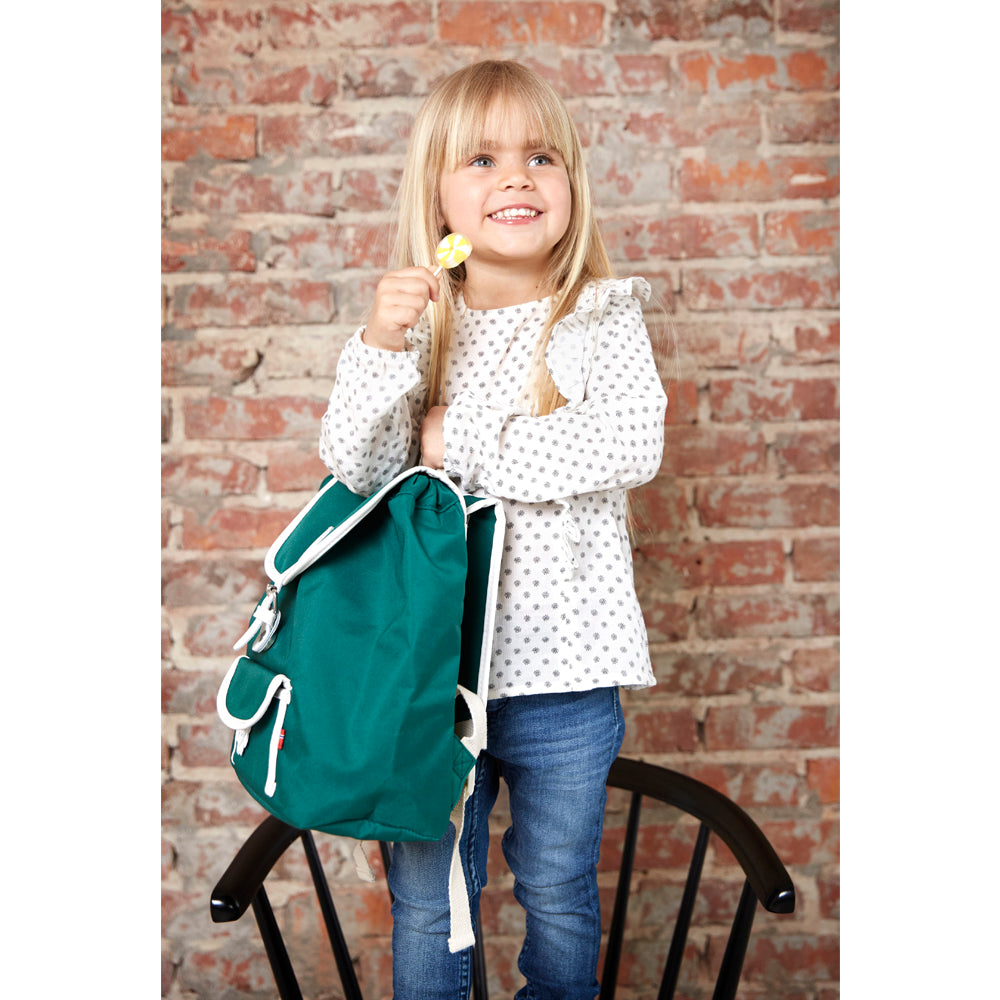 At the front you will find a front pocket with reflectors for extra visibility, a simple push-button buckle and plenty of space for a lunch box, bottle and small treasures from the day's trip.