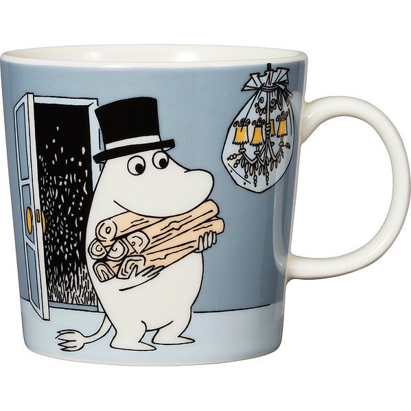 I den nye Arabia Moomin Classics-kolleksjonen forbereder Mummipappa Muminhuset for vinteren, slik at familien holder seg varm i vinterdvalen. Han sørger for at kulden holder seg ute og varmen inne ved å isolere vinduene med planker festet med spiker. Han sørger også for at det er nok ved til ovnen. Illustrasjonene er basert på Tove Janssons tegneserie Mummi-vinter fra 1959 og er arrangert på en sjarmerende, dempet grå bakgrunnsfarge med dempet gult i detaljene. Kruset har en tidløs form og design. Kruset kan vaskes i maskin og tåler frost, stekeovn og mikroovn. Volum: 0,3 l. Mummipappa-settet inneholder et krus (0,3 l), en tallerken (19 cm) og en skål (15 cm).